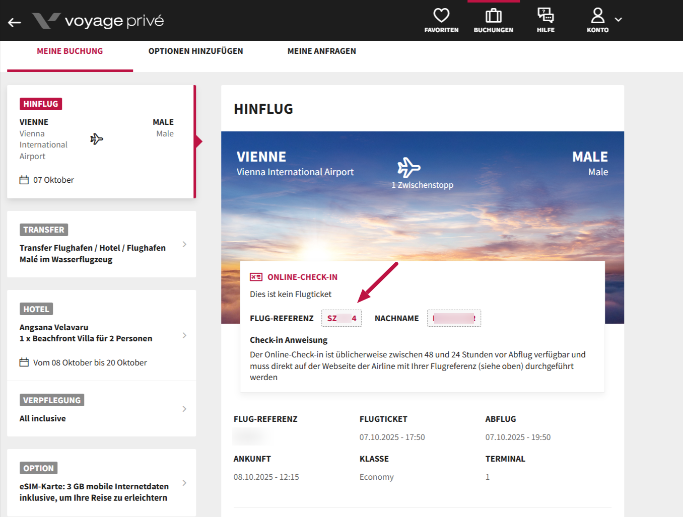 - Buchungsreferenz abrufen: Ihre Flugbuchungsnummer finden Sie im Buchungsbereich Ihres Mitgliedskontos oder in Ihren Reisedokumenten. Besuchen Sie anschließend die Website der Fluggesellschaft – der entsprechende Link befindet sich ebenfalls neben Ihrer Referenz.